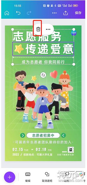2、点击这个图标就能删除对应的内容了,本身canva可画就是一款设计软件,所以里面没有绘图的工具,只能使用app中的素材以及导入图片进行设计创作,如果大家想要自己画原创的部分,最好更换到绘图软件中操作,使用橡皮擦工具和画笔工具就会很方便。