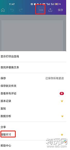 1、已经选择了画布的分辨率和尺寸,想要调整正在创作的作品,可以点击右上角的【...】,下拉菜单,找到【调整尺寸】选项。