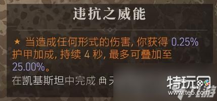 违抗之威能:当造成任何形式的伤害,你获得0.25%护甲加成,持续4秒,最多可叠加至25.00%。