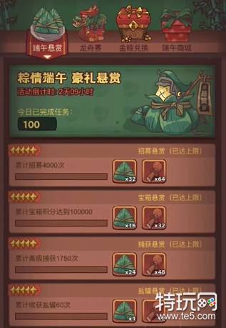 1、端午悬赏活动期间,大家可以通过招募、获得宝箱积分、高级捕获、收获盐罐和花费金砖五种方式,完成悬赏任务;