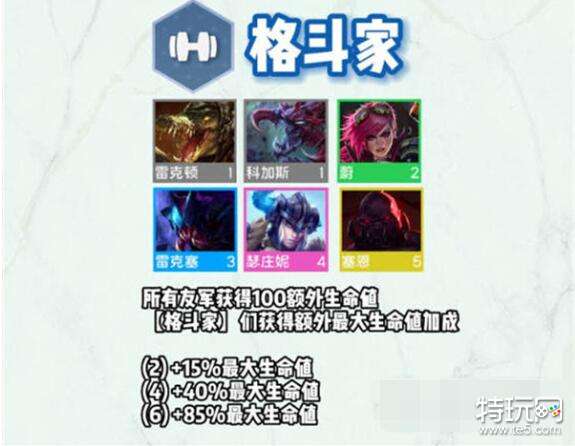 云顶之弈S9斗枪阵容怎么玩?相信玩家最期待的应该是即将要推出S9赛季的云顶之弈吧,根据官方爆料来看,大家对新推出的英雄战旗以及羁绊效果相信都非常熟悉了,只是还么有机会能够在游戏中测试强度,新赛季能够选择上分的阵容还是很多的,像是小编接下来将要介绍的斗枪阵容也是不错的选择。能够组成格斗家羁绊的英雄有六个,凑齐六个提升的最大生命值会更多,拿来作为阵容前排正好合适,像是鳄鱼、猪妹、赛恩和蔚都是很肉的,正好可以给后排提供输出空间。格斗家凑齐后可以试试枪手,枪手羁绊能够补充更多攻击力,整个体系下来肯定是很不错的。