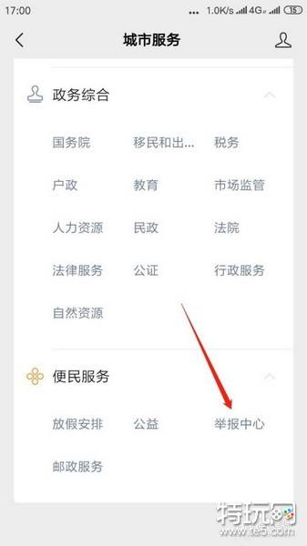 4.进入页面,向下翻页至便民服务栏,点击“举报中心”。