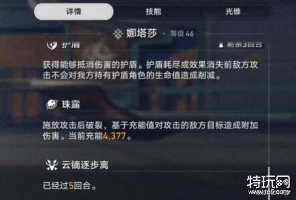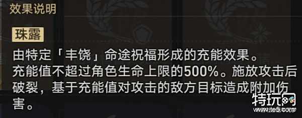 珠露造成充能量1∶1的附加伤害,升级后是1∶1.4。在战斗中点击我方角色头像可查看充能量,珠露充能量不为0时,我方角色左上角将有绿色光点,当角色对敌方造成伤害时消耗充能量造成对应的附加伤害。