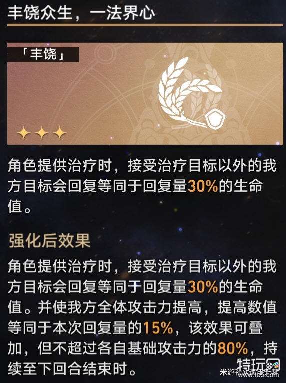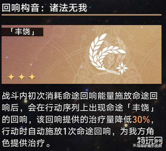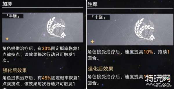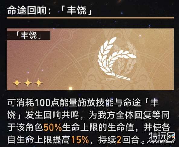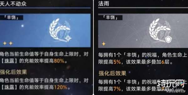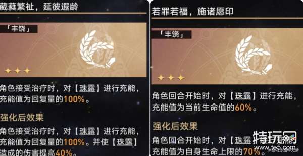 第一个祝福由丰饶角色中娜塔莎、白露,丰饶命途回响的治疗量为基础对珠露进行充能,不受生命上限影响,就算全队生命都是满的,也会增加对应治疗量的充能量。
