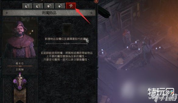 1、首先我们找到秘术师,选择上方最右边一个选项就是附魔。