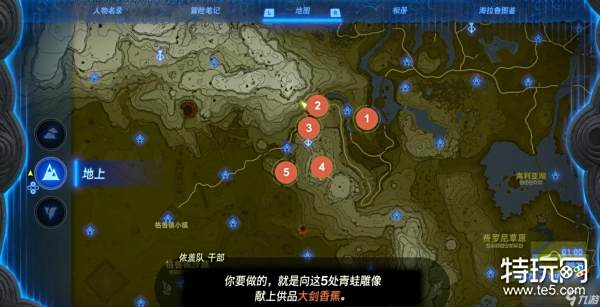 与房间中的伊盖队干部交谈开启考核,我们需要为散布在各处的五个青蛙雕像供奉大剑香蕉,雕像的位置会在地图上标记出来。