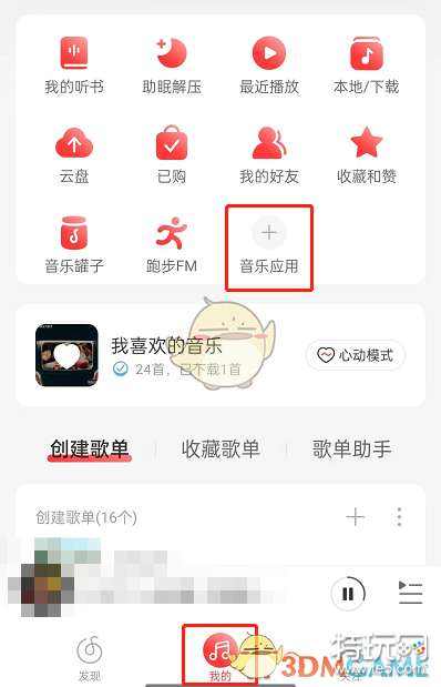 1、打开网易云音乐,点击我的,找到音乐应用,点击加号。