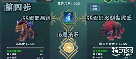 然后我们就开始宠物的融合了,首先将两只剑齿虎进行融合获得背上有岩石的虎类,然后将得到的宠物和剑齿虎王进行融合得到背上有岩石晶体的虎类,在将它和红色的岩火剑齿虎进行融合,最后将得到的宠物和虎王融合,就可以得到我们想要的白虎种类了。