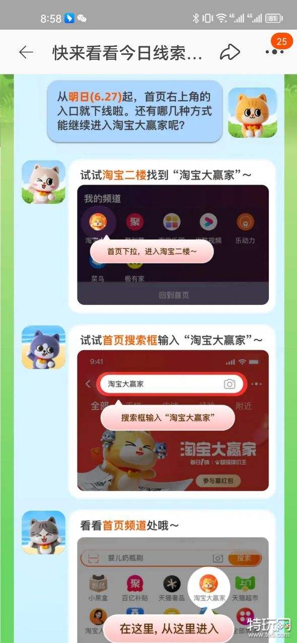 据说从明日(6.27)起,首页右上角的入口就下线了,还有哪几种方式进入淘宝大赢家呢?