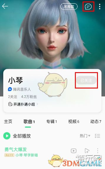 2、点击进入小琴的个人界面,关注后,点击右上角私信图标。
