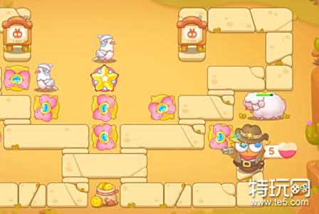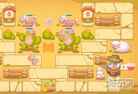 开局先在中间放置一个蝴蝶结回力镖既可以攻击路过的兔子也可以攻击周围的障碍物和小羊。