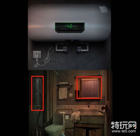 2、然后进入娱乐室,将左上角的热水器插上电源,在进入浴室打开花洒,这个时候镜子上就会出现冰箱盒子的密码:1215