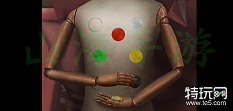 4、再使用螺丝刀撬开右边柜子上和右边桌子上的铁盒子,获得红黄两个木块,然后放到木偶身上,正确摆放如图所示:
