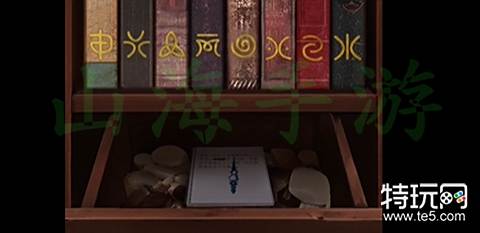 7、按照破损的照片排列书架上面的书,然后就能打开下面的抽屉,获得钟表的指针,并且把指针放到钟表上面,点击钟表下面两个按钮左边的按钮,调整到九点。