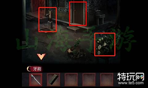 1、进入内院之后,点击压水器和右边的花台,获得牙刷和一块砖头,然后使用砖头将靠近水龙头的一扇门上的生锈锁打开。