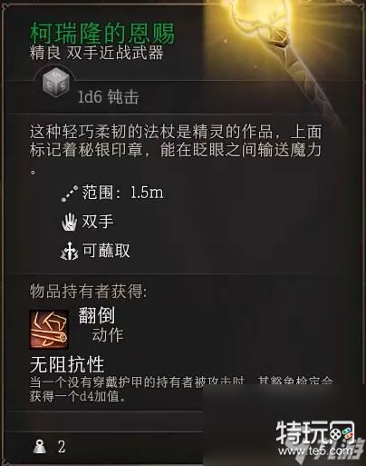 1、柯瑞隆的恩赐:1d6钝击,双手近战法杖:持有者未着甲被攻击时豁免额外增加1d4。