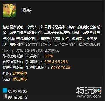 一技能是小鹿生存的保障,也是他劣势路如此火热的一个重要原因。攻击速度降低20/70/120/170,所有直接攻击魅惑魔女的单位都会被减速,减果在攻击单位产生攻击动作时出现,而不是伤害产生时生效。