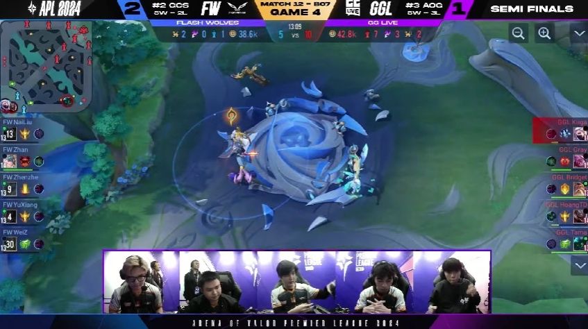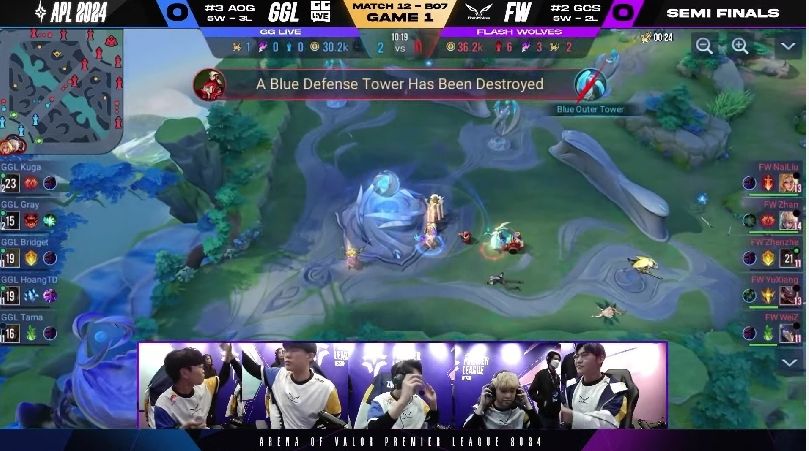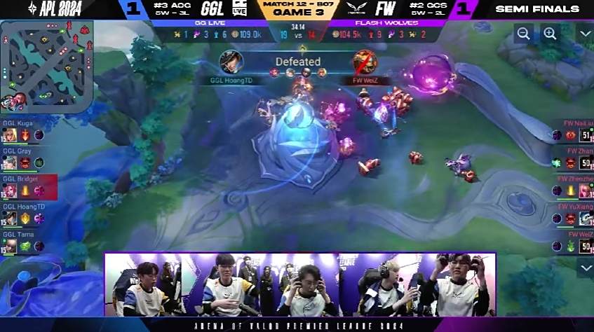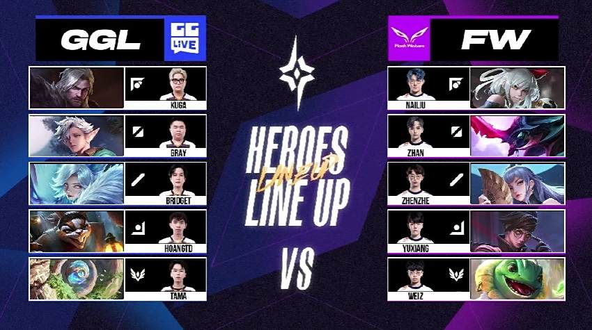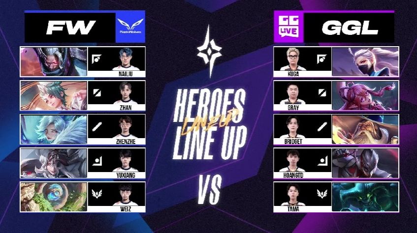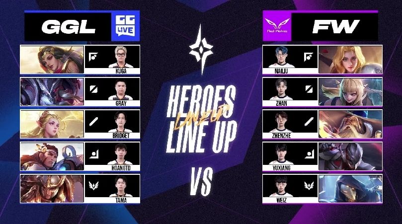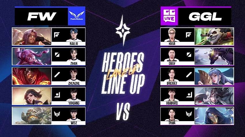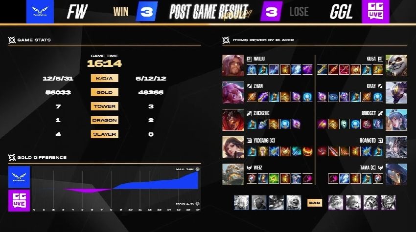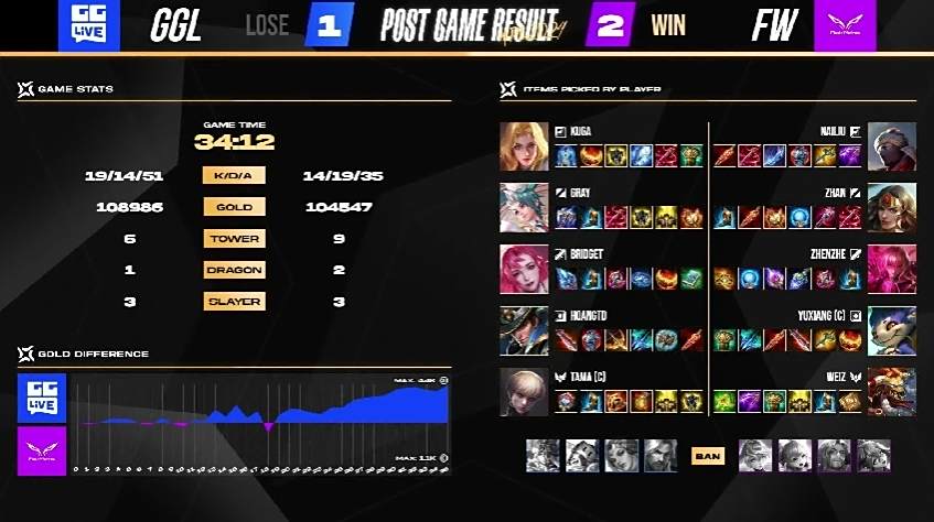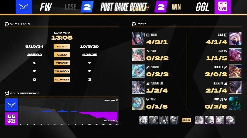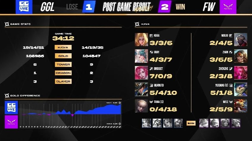 FW 很快在游戏初期拿到两颗人头以及魔龙,以凯野连动的方式滚动上半部地图的优势,GGL 被迫只能缩小防守範围,尝试抵挡对方攻势。6 分钟时,FW 加紧脚步打出一换四的优势团战,拉开 4k 左右的经济领先,FW NaiLiu 夏洛特就领先超过 1.7k。比赛时间 10 分钟时,FW 打出一换五的团战以秋风扫落叶之姿旗开得胜。FW NaiLiu 选手在凯撒路成功单杀 GGL Kuga 打出对位差距,是本场赛事的 MVP。