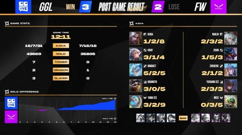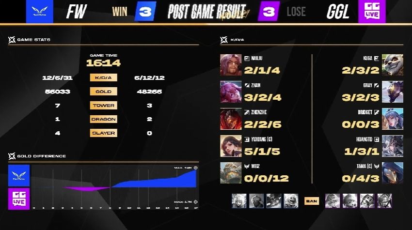 进入第七场后 BP 全开,本场 GGL 执蓝方出阵,FW 快速在 40 秒左右就拿下首杀,由打野 Zhan 帮助魔龙路 YuXiang 建立优势局面。接着 GGL 掌握几次 FW NaiLiu 的失误,缓住了 FW 的攻势并持续进行发育。双方在 9 分钟时于魔龙爆发团战,然而 FW 打野 Zhan 在关键时刻偷到了凯撒,也成功在最终上演逆转戏码,以 4:3 淘汰 GGL 挺进明天的赛事。