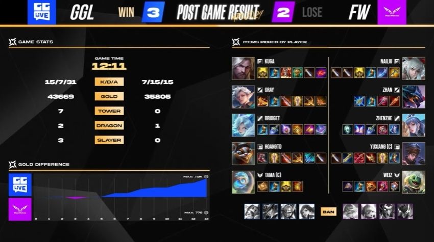 15 分钟时,FW 虽然打出一波胜利团战拿下凯撒,但 NaiLiu 也过于深入被对方击杀。FW 在 17 分钟成功踏上高地,一波猛烈进攻但仍被 GGL 守住主堡。儘管有两路高地的优势,但 FW 仍与 GGL 僵持不下,无法进一步有所突破。23 分钟时,FW 虽然发生失误,但射手 YuXiang 在团战中全力输出打出 3 换 3,尽可能降低损失。31 分钟时,FW 果断开战拿到魔神凯撒,带着 Buff 踏破 GGL 三路高地。最终牛魔王 WeiZ 与莫拉 NaiLiu,强行推掉主堡拿下胜利。最终由中路 Zhenzhe 获得 MVP。