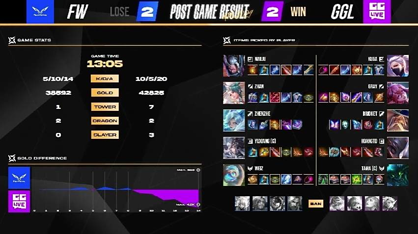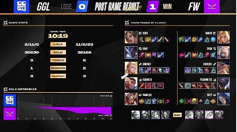 本场 FW 选择留在红方,尝试拿出 Counter Pick 克制 GGL。比赛时间 2 分钟时打野 Zhan 在下路不慎遭到 GGL 伏击,交出了首杀。FW 在 6 分钟时于中路出现破绽,GGL 也把握机会拿下人头。而 NaiLiu 在野区抓到落单的 Gray,抓下人头也顺势吃下凯撒,弭平了双方的经济差距。FW 接下来也出现不少失误,让 GGL 持续扩大优势,FW 只能转为被动防守、寻找机会。
