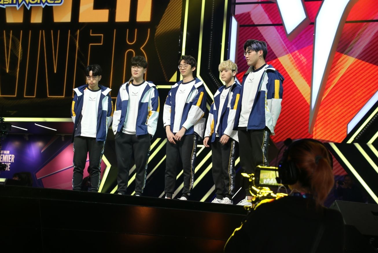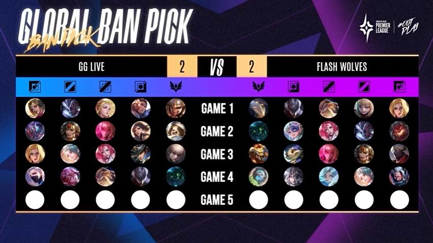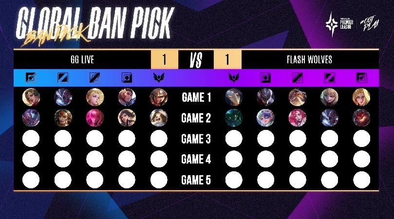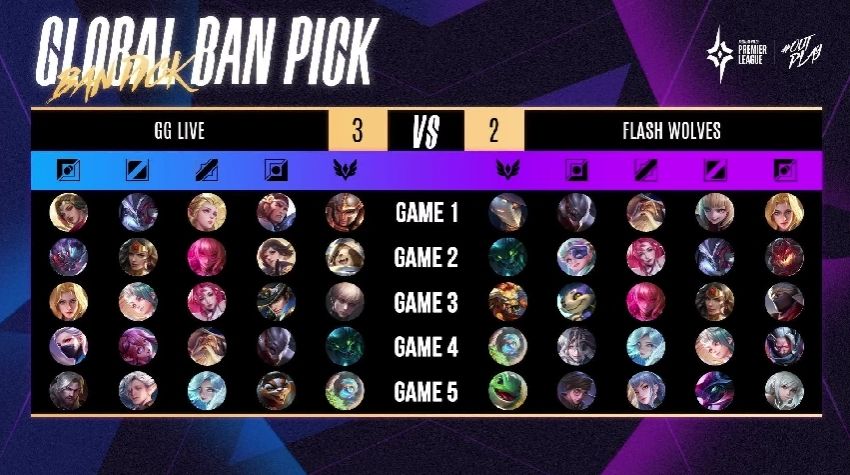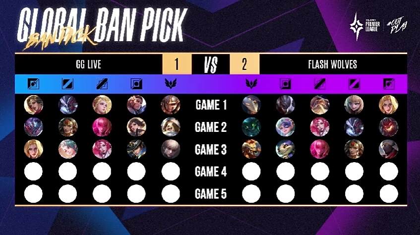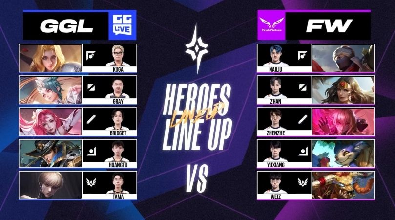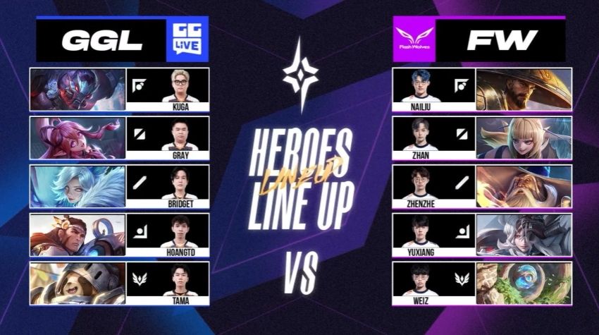 第五场赛事 FW 回到熟悉的红方出击,FW YuXiang 及 NaiLiu 的快速支援拿下 GGL 两颗人头,GGL 随后反击连人带塔一口气拿下,开始取得小幅度的经济领先。接着两边在中上两路来回碰撞小型团战,但 GGL 仍旧维持着有利局面,经济领先超过 4k。10 分钟时,FW 中路高地塔告破,但抓到了 Kuga 的人头勉强守住高地。12 分钟时,GGL 在抓到优势的情况下加上古木 Tama 的关键留人,一口气推到底 3:2 拿下听牌局。本场由 GGL 中路 Bridget 的莉莉安拿下 MVP。