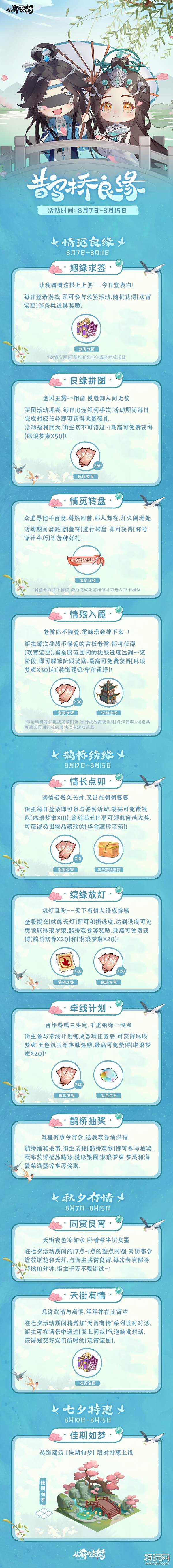 「鹊桥良缘」七夕主题活动将于8月7日-8月15日限时开启!开服天数达到13天即可参与。活动期间,登录游戏前往「鹊桥良缘」活动界面,参与七夕系列活动可免费领取【称号·穿针斗巧】、【装饰建筑·宁和通塔】和130抽【琳琅梦柬】等惊喜好礼!