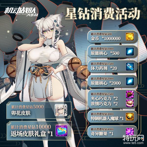 更新后,指挥官可通过“军需-活动福利-累计消费”参与活动。活动期间,累计消费星钻可解锁获得:金币、体力药剂、奇异糖果、【卯花】限定皮肤以及限定返场皮肤礼盒等奖励。
