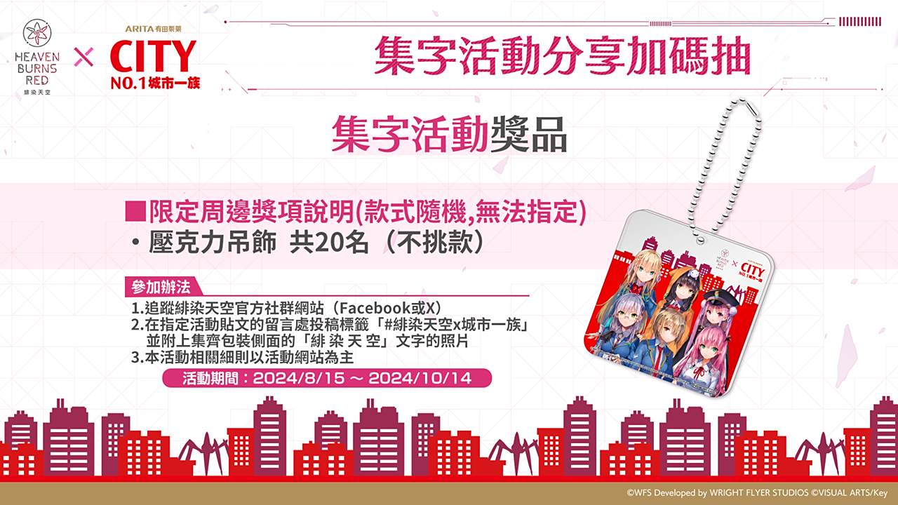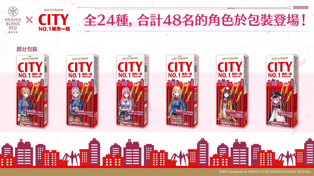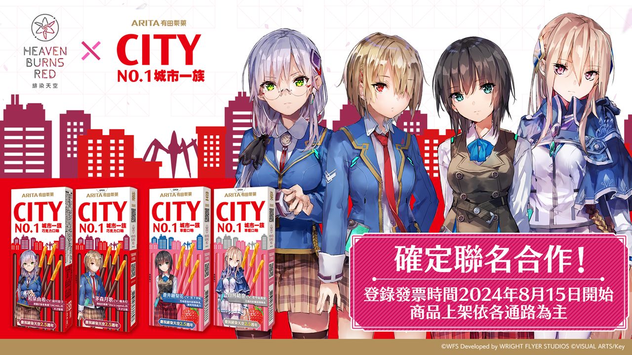 Wright Flyer Studios × Key旗下《绯染天空 Heaven Burns Red》与CITY NO.1合作推出联名包装,含24种设计,活动自8月15日至10月14日,购买指定商品可参与抽奖赢取限定奖品。同时,游戏2.5周年纪念活动提供连续登录奖励、免费探索连抽等福利。详情见官网及Facebook活动页。