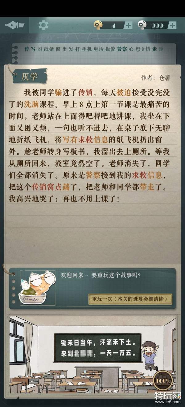 《海龟蘑菇汤》厌学是游戏中的一个关卡,玩家在这个关卡中会有很多的词条需要进行破解,只有找到正确的词条才能够还原事件的真相,可能有玩家还不知道这关要怎么过,下面特玩网小编就给大家整理了具体的通关攻略,一起来看看吧!