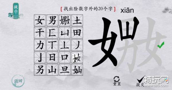 3、口加力是另字,日加一横是旦。女加旦是妲,女加女是奻(nuán),女加山是奾(xiān),最终找齐20个除数字外的汉字即可过关