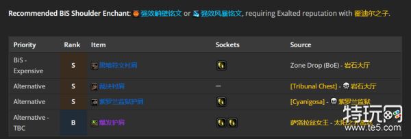 肩部装备团本前的最优解是黑暗符文衬肩,P1阶段是勇猛的救赎肩甲,附魔推荐强效峭壁铭文、强效风暴铭文,