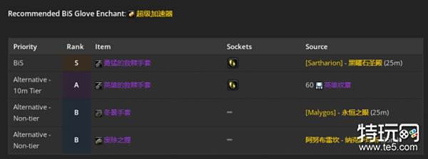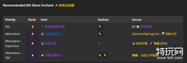 手套装备团本前的最优解是英雄的救赎手套,P1阶段是勇猛的救赎手套,附魔推荐超级加速器