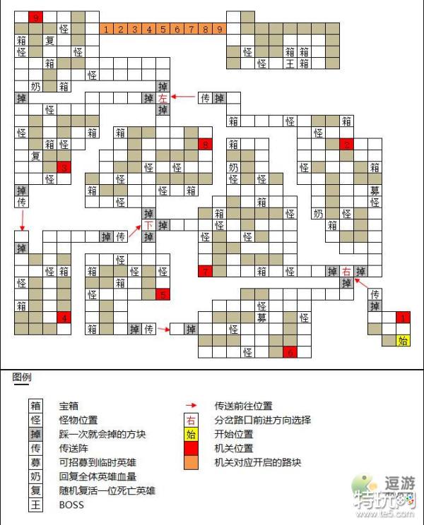 2、请仔细看图解,每次传送后选择方向,机关位置,怪的位置和宝箱位置都有标识清楚