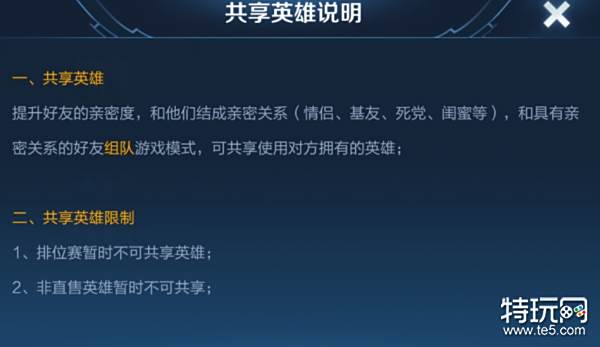 1、可以共享英雄第一条件是玩家之间的亲密度要达到一定的数值,并且要结成亲密关系,例如情侣,基友,闺蜜等。
