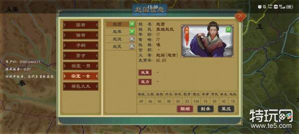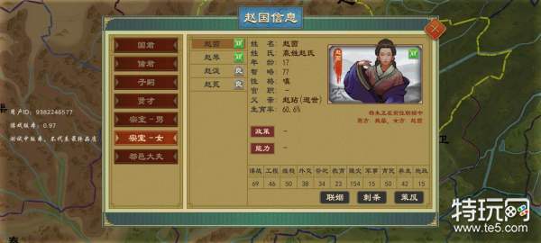 3、然后点击右上方的国君头像,可以看到该国的国家信息界面,选择宗室-女,查看这个国家的宗亲女眷具体信息