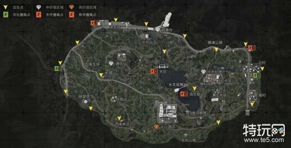 北山:北山是目前面积最大的一张地图,绝大部分出生点都位于地图边缘,少数靠近中央的出生点则围绕着北山酒店分布。