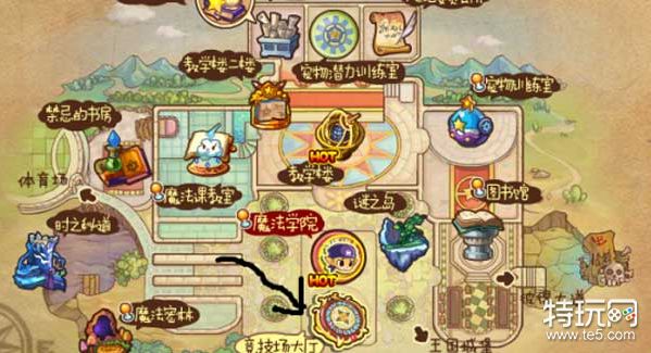 1、小洛克们要先到魔法学院,点击竞技场大厅进入神殿入口。