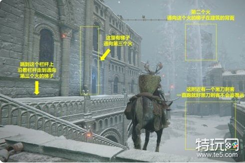 11. 完成仪典镇的解谜,前往圣树。这里的解谜和魔法镇瑟利亚类似,但最好是带好一面大盾,不然会被两个弓箭手射成刺猬。如果害怕隐身的黑刀刺客,在王城遁世商人处购买哨兵火把可以让刺客显形。但是就我自己三次解谜的体验来说,只要一直跑就不会被黑刀刺客逮住。