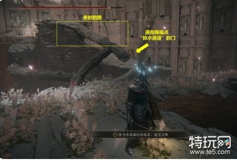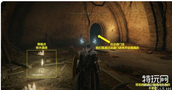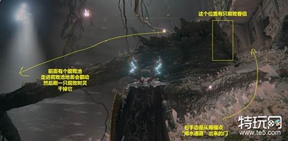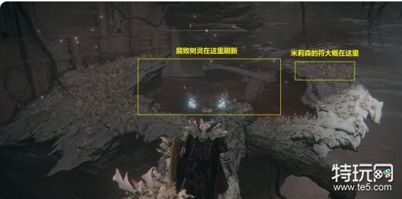 13. 继续探索,直至找到赐福点“排水通道”。从该赐福点出发,按如图所示的路线找到腐败树灵。击败腐败树灵后,可以在一旁找到米莉森的印记。接受米莉森的召唤,帮助她击败她的姐妹们。战斗结束后获得护符“腐败剑翼徽章”。
