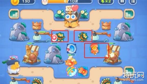 5、第五波把蓝色塔升满级,雪球塔升满级,右侧加一爆竹,之后升一级,中间加两多重箭。