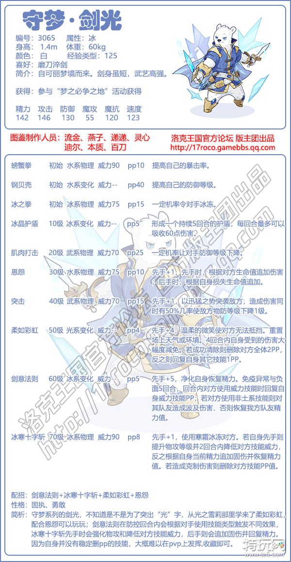 1、洛克王国守梦剑光技能配招:剑意法则+冰寒十字斩+柔如彩虹+恩怨