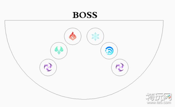 场地为半圆形区域。场地中有6个元素矩阵,除了雷元素矩阵外,其余矩阵没有触发次数限制,雷元素为2个元素矩阵,每个雷元素矩阵只能触发一次。