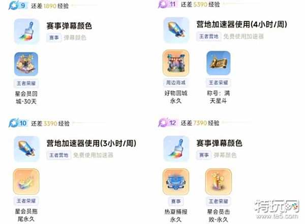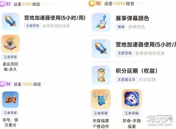 在成就曝光之后,有玩家有曝光了星会员的奖励,9级之后,奖励也越来越丰厚,除了营地加速器使用时长和赛事的弹幕颜色之外,9级会有30天星会员回城;10级有永久的星会员拖尾;11级有好物回城特效和称号:满天星斗;12级有热夏播报和星会员击败特效;13级有永久星会员回城;14级有称号:银汉星河;15级有天降福星个性动作和梦奇的天降福星皮肤。