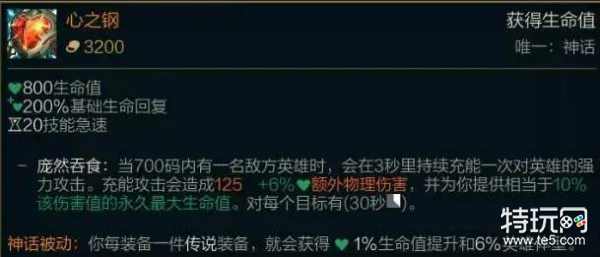 1、心之钢基础属性800生命值、200%基础生命回复、20技能急速