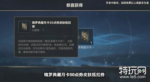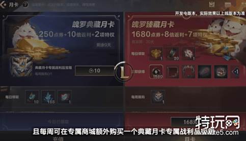 本次推出的月卡共分魄罗典藏月卡和魄罗臻藏月卡两种。购买魄罗典藏月卡的召唤师,可立即获得250点券、魄罗典藏月卡50点券皮肤抵扣劵,并提升峡谷宝典2级。