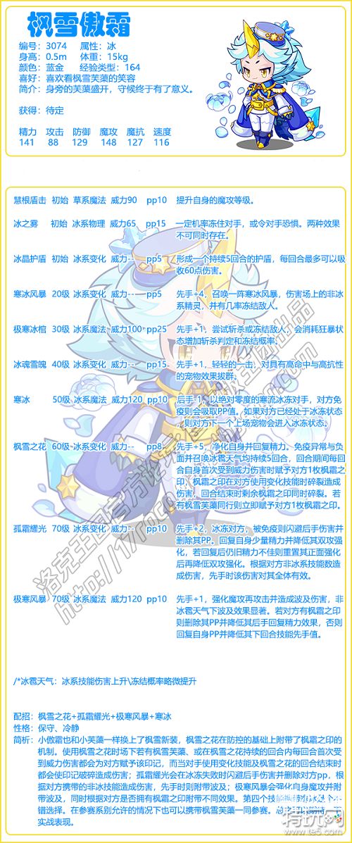 3、简析:小傲霜也和小芙藻一样换上了枫雪新装,枫雪之花在防控的基础上附带了枫霜之印的机制。使用枫雪之花时场下若有枫雪芙藻、或在枫雪之花持续的回合内每回合首次受到威力伤害都会为对方赋予该印记,而当对手使用变化技能及枫雪之花的回合结束时都会使印记破碎造成伤害;孤霜耀光会在冰冻失败时闪避后手伤害并删除对方pp,根据对方携带的非冰技能造成伤害,先手时则附带波及;极寒风暴会强化自身魔攻并附带波及,同时根据对方是否拥有枫霜之印附带不同效果。第四个技能携带寒冰是个不错选择。在参赛系别允许的情况下也可以携带枫雪芙藻一同参赛。总之可以期待一下实战表现。