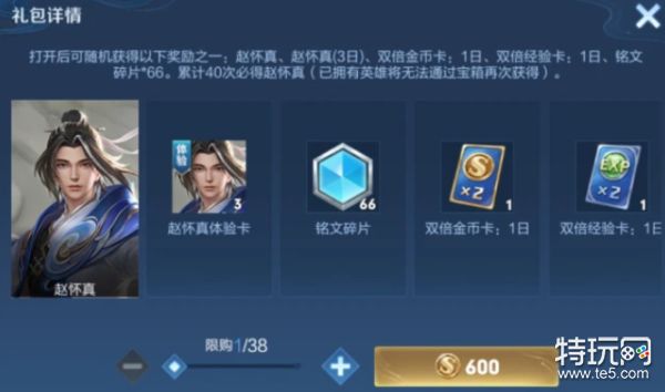 第一个获取方式是直接在商城中购买赵怀真英雄宝箱,这个宝箱需要600金币,开启宝箱我们就有机会拿到赵怀真了,保底40次,必得赵怀真永久,这也意味着,我们最多花24000金币就能拿下赵怀真了,这相比于其他英雄,价格就显得有点高了,不过如果运气好,600金币也能拿到。
