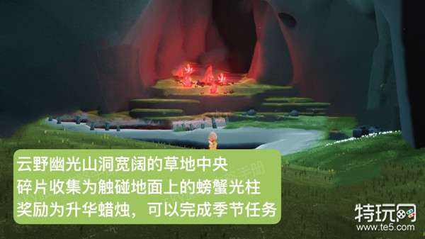 来到幽光山洞的草地上,触碰螃蟹光柱,全部收集完获得升华蜡烛。