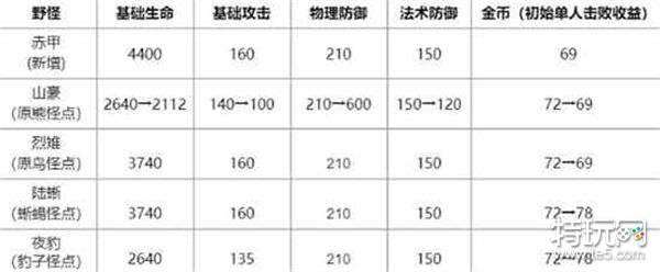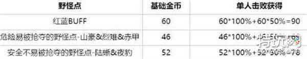 在保持野区产出总量不变前提下,通过资源点危险程度判断对经济进行一定的调整,越靠近己方的资源点金币越多,比如增加豹子怪点的经济,而越容易被敌方入侵和反野的资源金币越少。野怪属性一览表: